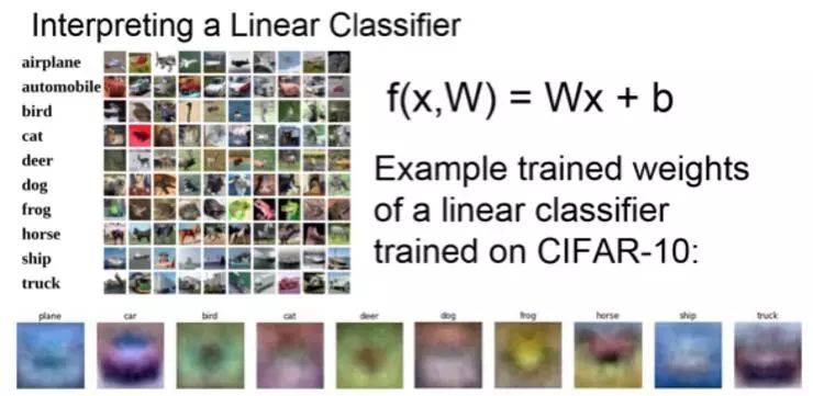 如果根据这个模板匹配的观点,考虑分类器,实际上,可以取这个权重矩阵的行向量,并且将他们还原为图像。这个例子中,在图像上训练好一个线性分类器,下方是数据集中训练到的权重矩阵中的行向量对应于 10 个类别相关的可视化结果。