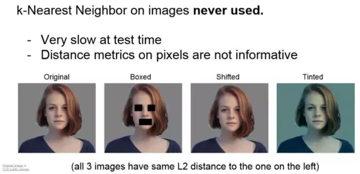 图中左边图的女生和右边三张经过不同处理的图片,如果计算他们和原图的欧式距离,会得到相同的答案,这并不是想要的。可以感觉出来 L2 不适合表示图像之间视觉感知的差异。