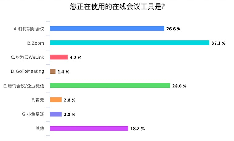 调查发现,Zoom 的使用率很高,占 37%,其次是腾讯会议和各类微信系列,第三是钉钉。WeLink、小鱼易连、GoToMeeting 也比较常见。“其他”选项中还提到了:Jabber、Chime、瞩目、MAXHUB、Webex、飞书、Hi、YY、Avaya IX™ Workplace、联通视频会议。