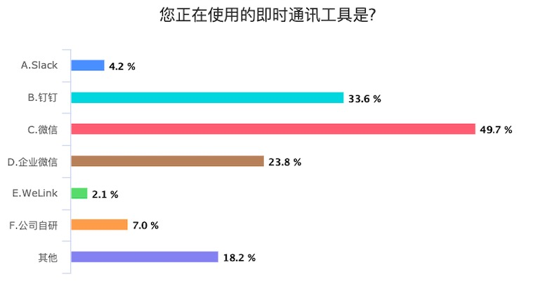 1、主流的即时通讯工具还是微信、钉钉,企业微信也在短期内迅速占领市场,公司自研的占比也很高,Slack、WeLink 紧随其后。“其他”项的工具包括:Skype、轻推、瞩目、Telegram、RinCentral、飞书、Hi、豆芽、POPO、TalkLine、大象。