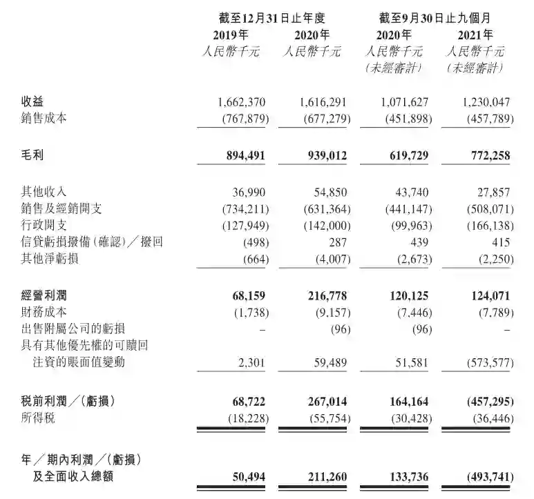 净利润方面,薇美姿从2019年的0.5亿元,增长至2020年的2.11亿元。2021年前三季度,薇美姿的净利润亏损达到4.94亿元,原因来自当期计入5.74亿元的账面值变动,经调整净利润为1.29亿元。