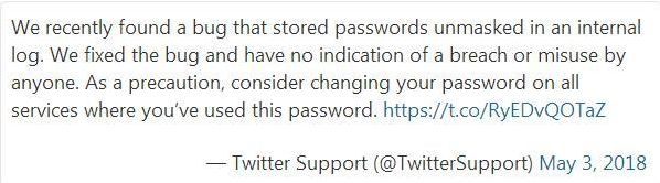 由于软件缺陷,Twitter用户密码被写入一个未指定的“内部日志”,然后才能转换成一系列数字。尽管目前Twitter一再表示没有人会以不正确的方式访问日志,但用户密码很容易受到攻击的事实是存在的。