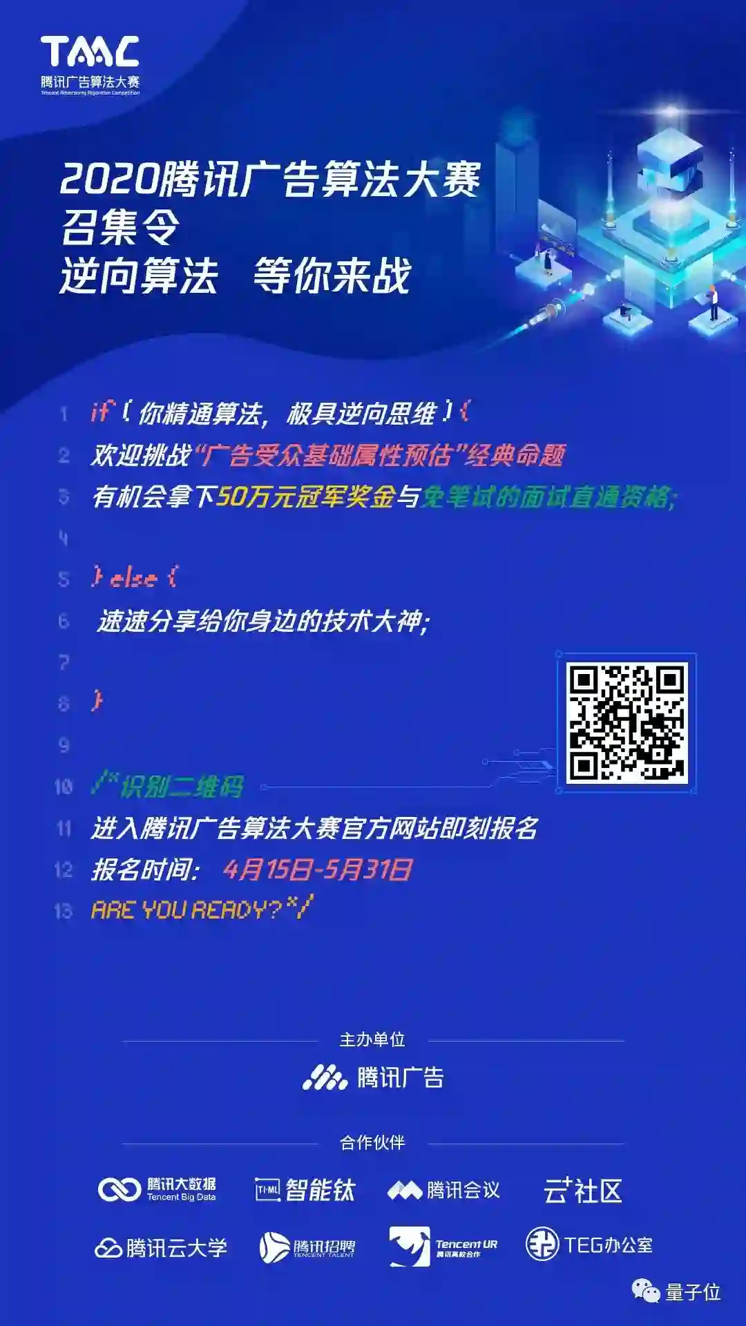 高实践价值的趣味赛题、丰厚的奖金福利,还有顶级评委团队助阵,算法界硬核切磋风云再起,还等什么?赶紧线上报名参与2020腾讯广告算法大赛吧!