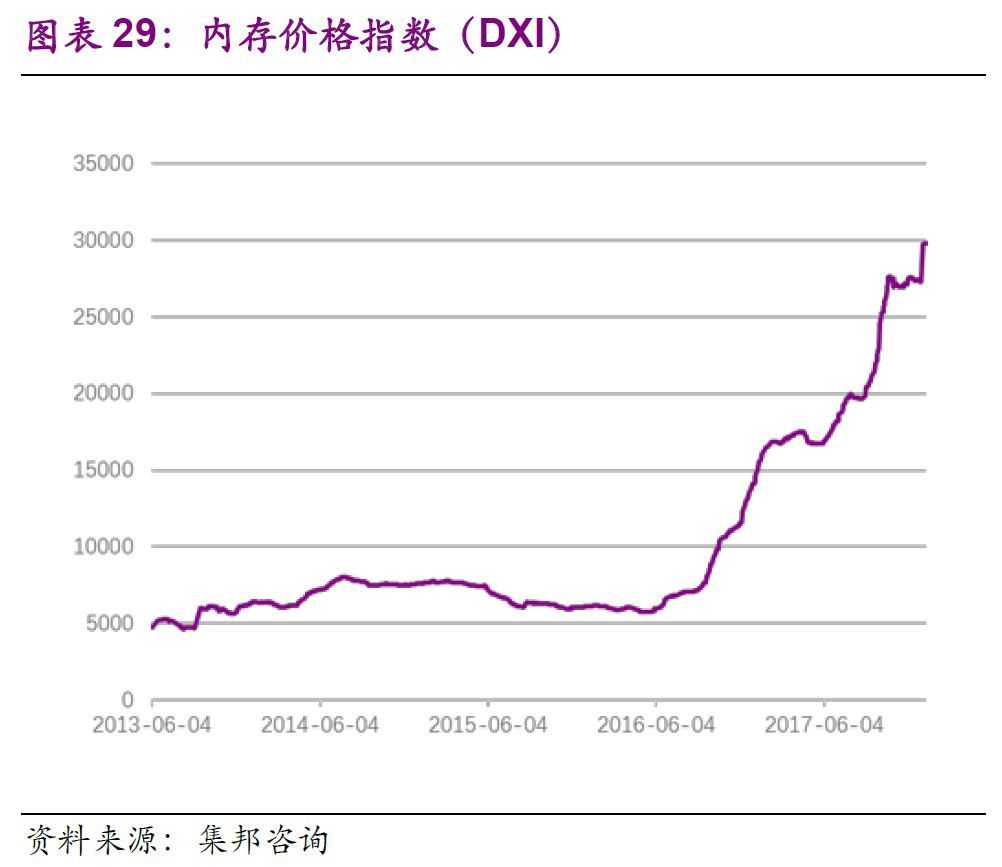 供给端:DRAM主要掌握在三星、海力士、美光等几家手中,呈现寡头垄断格局,三星市占率约为45%。2016年Q3之前,DRAM价格一路走低,所有DRAM厂商都不敢贸然扩产。供不应求导致DRAM价格从2016年Q2/Q3开始一路飙升,DXI指数从6000点上涨到如今的30000点。DXI指数是集邦咨询于2013年创建反映主流DRAM价格的指数。