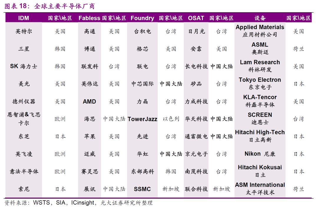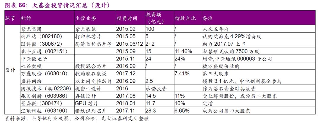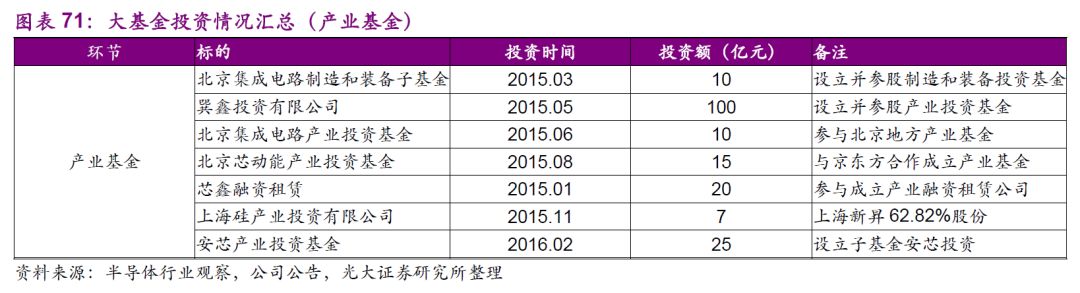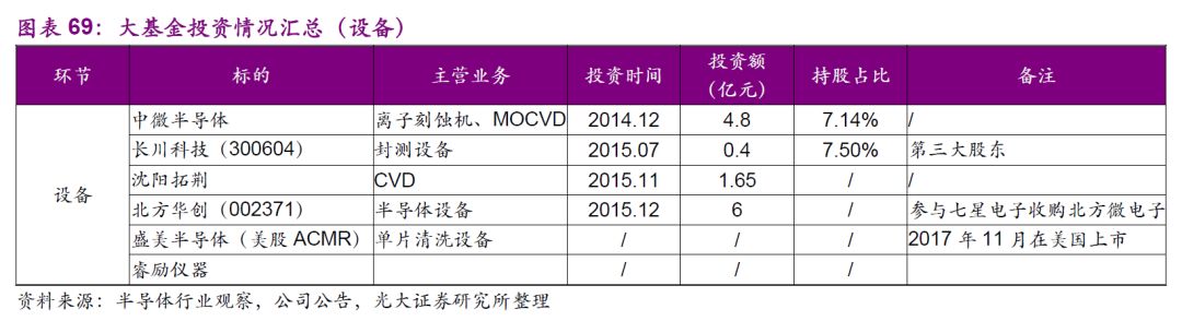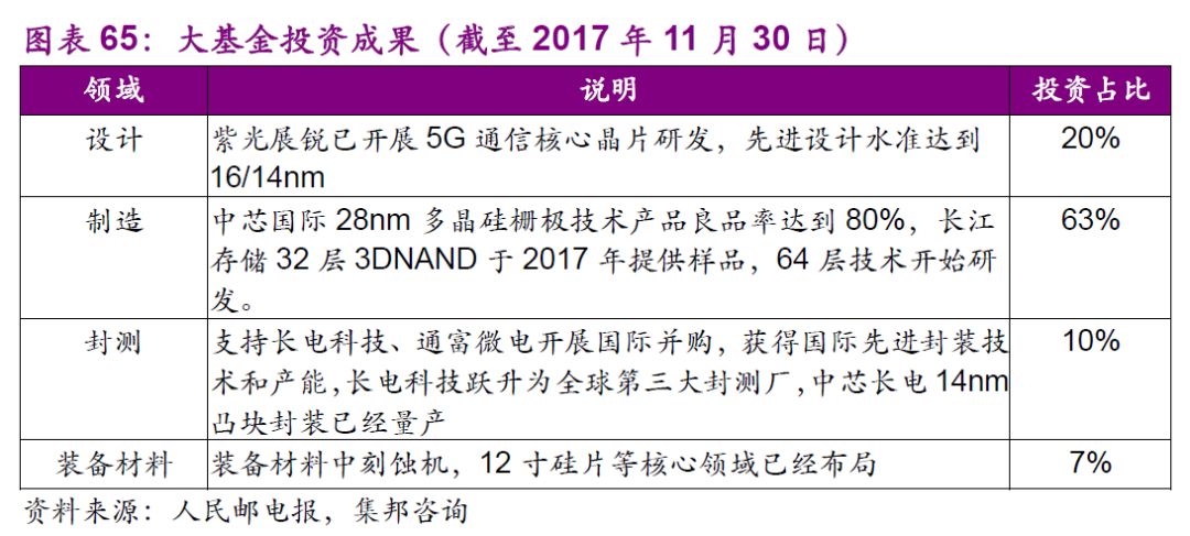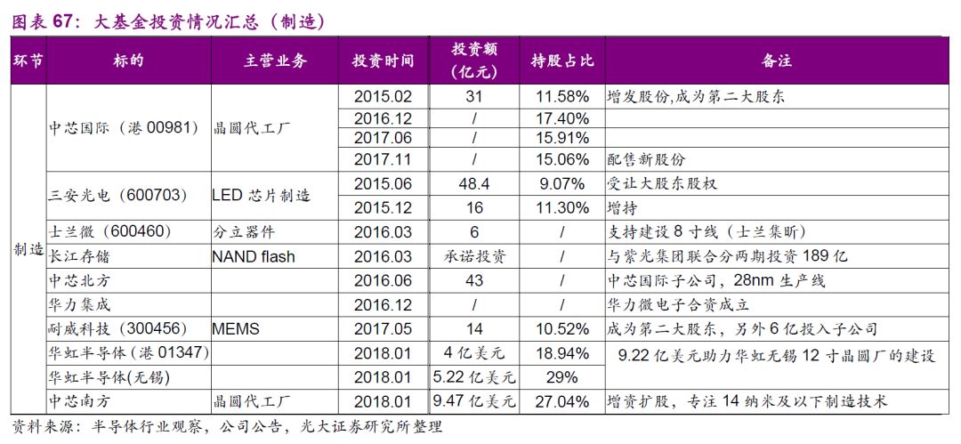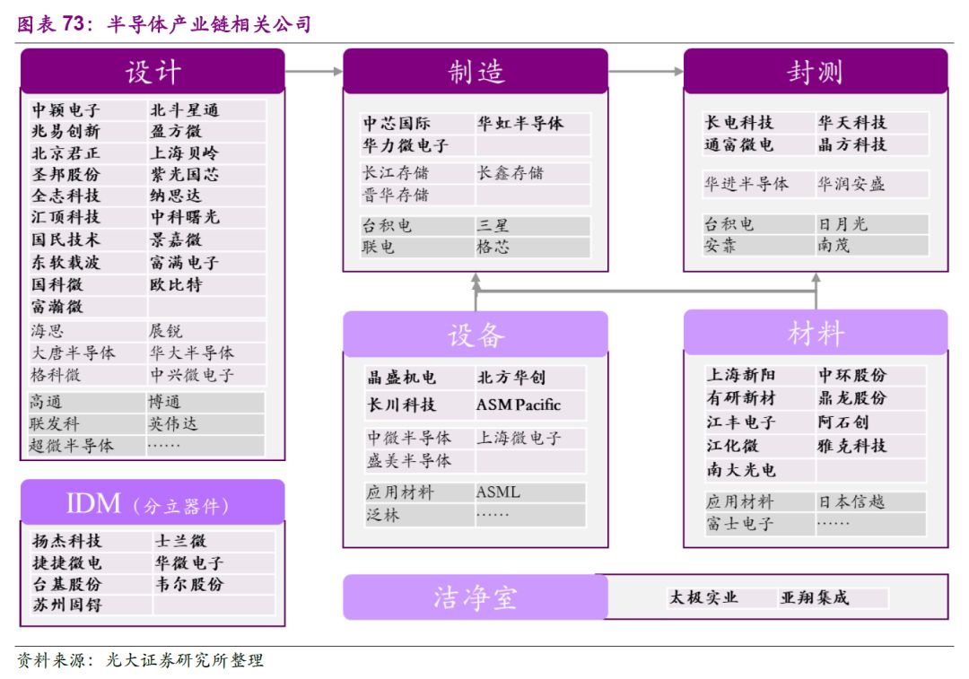 设计:兆易创新,紫光国芯,圣邦股份;制造:中芯国际;封测:长电科技,华天科技;分立器件IDM:扬杰科技;设备:北方华创,长川科技;材料:上海新阳,江丰电子。
