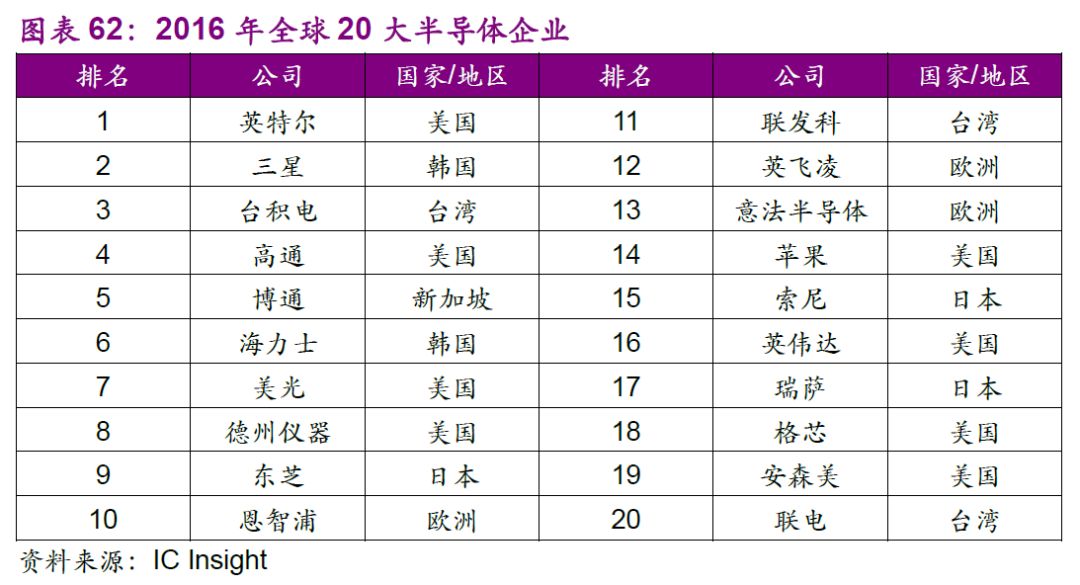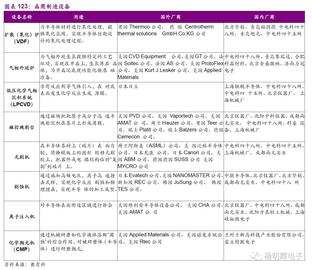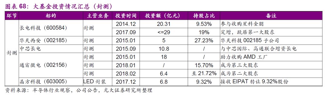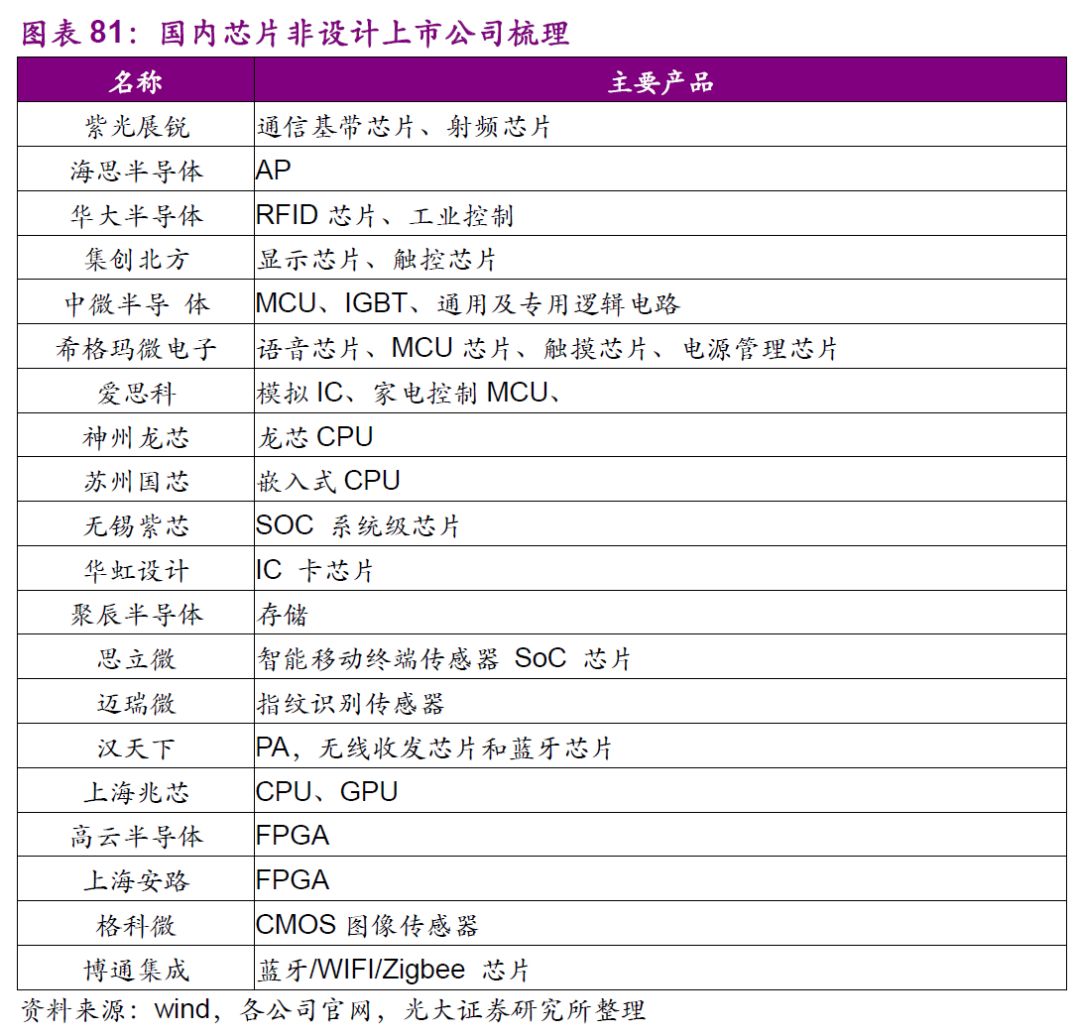 设计:兆易创新,紫光国芯,圣邦股份;制造:中芯国际;封测:长电科技,华天科技;分立器件IDM:扬杰科技;设备:北方华创,长川科技;材料:上海新阳,江丰电子。