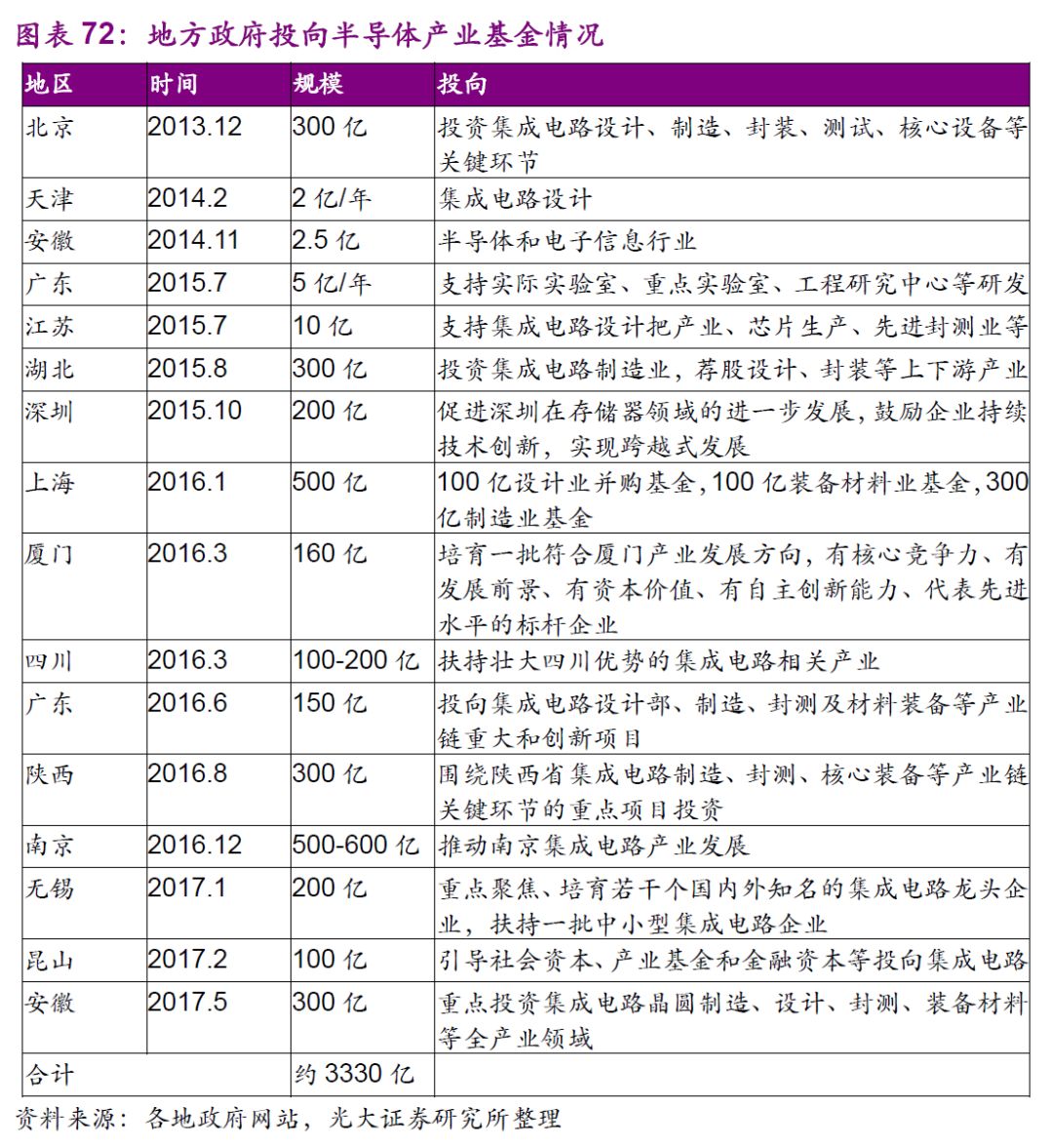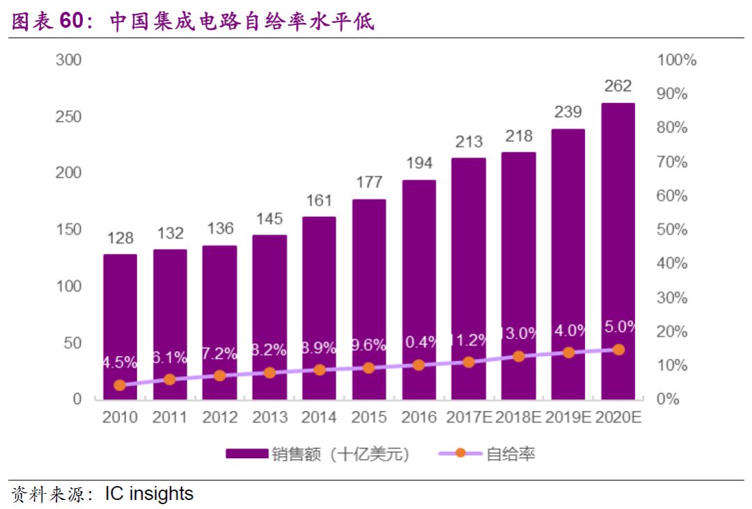 国内半导体市场接近全球的三分之一,但国内半导体自给率水平非常低,特别是核心芯片极度缺乏,国产占有率都几乎为零。芯片关乎到国家安全,国产化迫在眉睫。2014年《国家集成电路产业发展推进纲要》将半导体产业新技术研发提升至国家战略高度。大基金首期投资成果显著,撬动了地方产业基金达5000亿元,目前大基金二期募资已经启动,募集金额将超过一期,推动国内半导体产业发展。