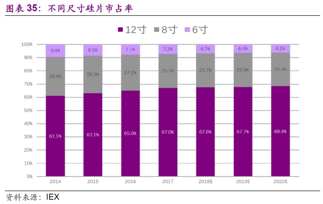 目前主流的硅片为300mm(12英寸)、200mm(8英寸)和150mm(6英寸),其中12英寸硅片份额在65-70%左右,8寸硅片占25-27%左右,6寸占6-7%左右。近年来12英寸硅片占比逐渐提升,6和8寸硅片的市场将被逐步挤压,预计2020年二者合计占比由2014年的40%左右下降到2020年的30%左右,而更大尺寸450mm(18英寸)产能将在19年开始逐步投建。