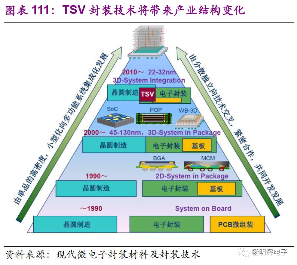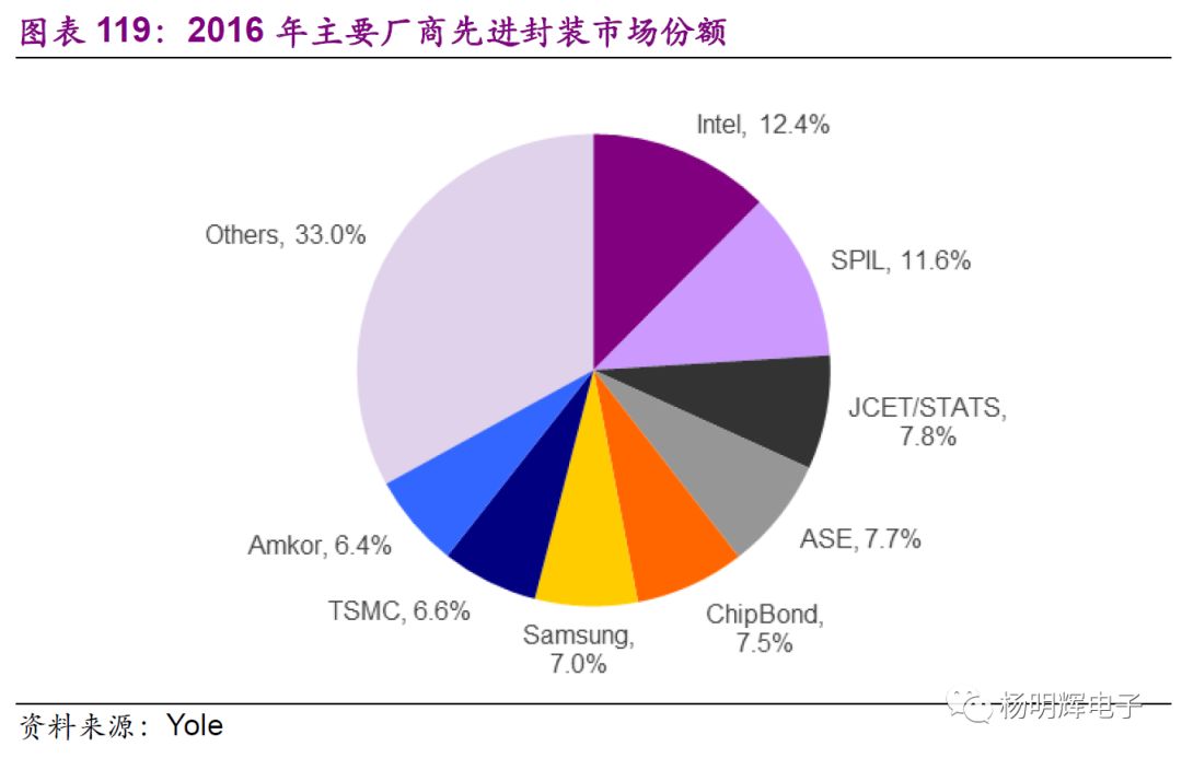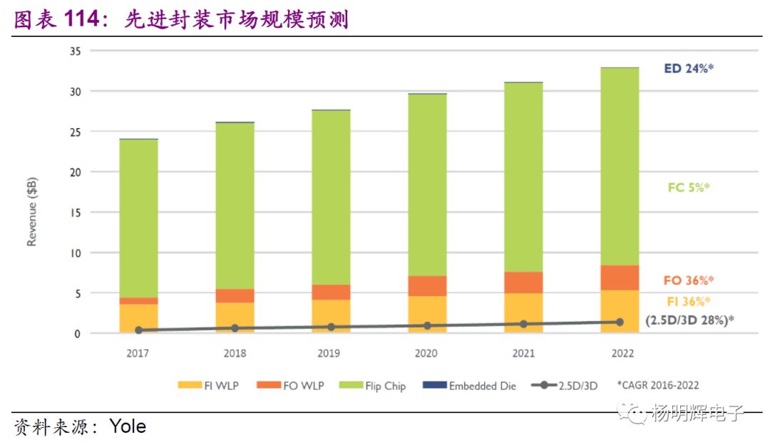 以台积电为例,晶圆制造的制程每隔几年便会更新换代一次。近几年来换代周期缩短,台积电2017年10nm已经量产,7nm将于今年量产。苹果iPhoneX用的便是台积电10nm工艺。除了晶圆制造技术更新换代外,其下游的封测技术也不断随之发展。