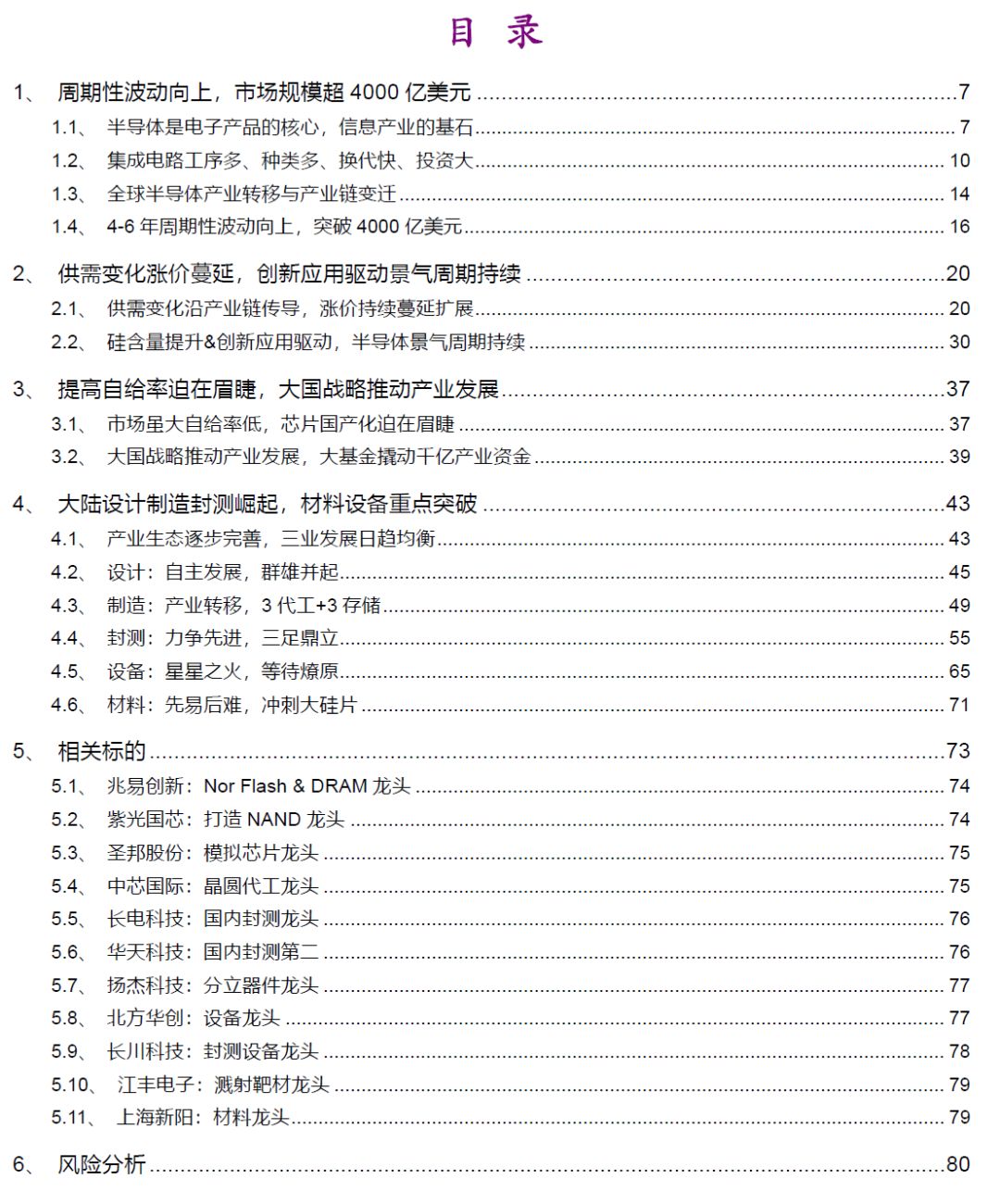 在半导体行业景气度高企,物联网、5G、AI、汽车电子等创新应用驱动下,国家政策大力支持,产业逐渐向国内转移,国产化替代加速的大背景下,国内半导体产业快速发展,相关公司有望深度收益。设计:兆易创新,紫光国芯,圣邦股份;制造:中芯国际;封测:长电科技,华天科技;分立器件:扬杰科技;设备:北方华创,长川科技;材料:江丰电子,上海新阳。