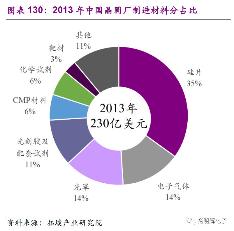 近年随着出货片数成长,中国半导体制造材料营收也由2013年230亿美元成长到2016年的242亿美元,年复合成长率约1.8%。从细项中可看出硅晶圆销售占比由2013年35%降到2016年的30%。根据拓墣产业研究院预计,2017年中国半导体材料市场,增长幅度将超过10%。
