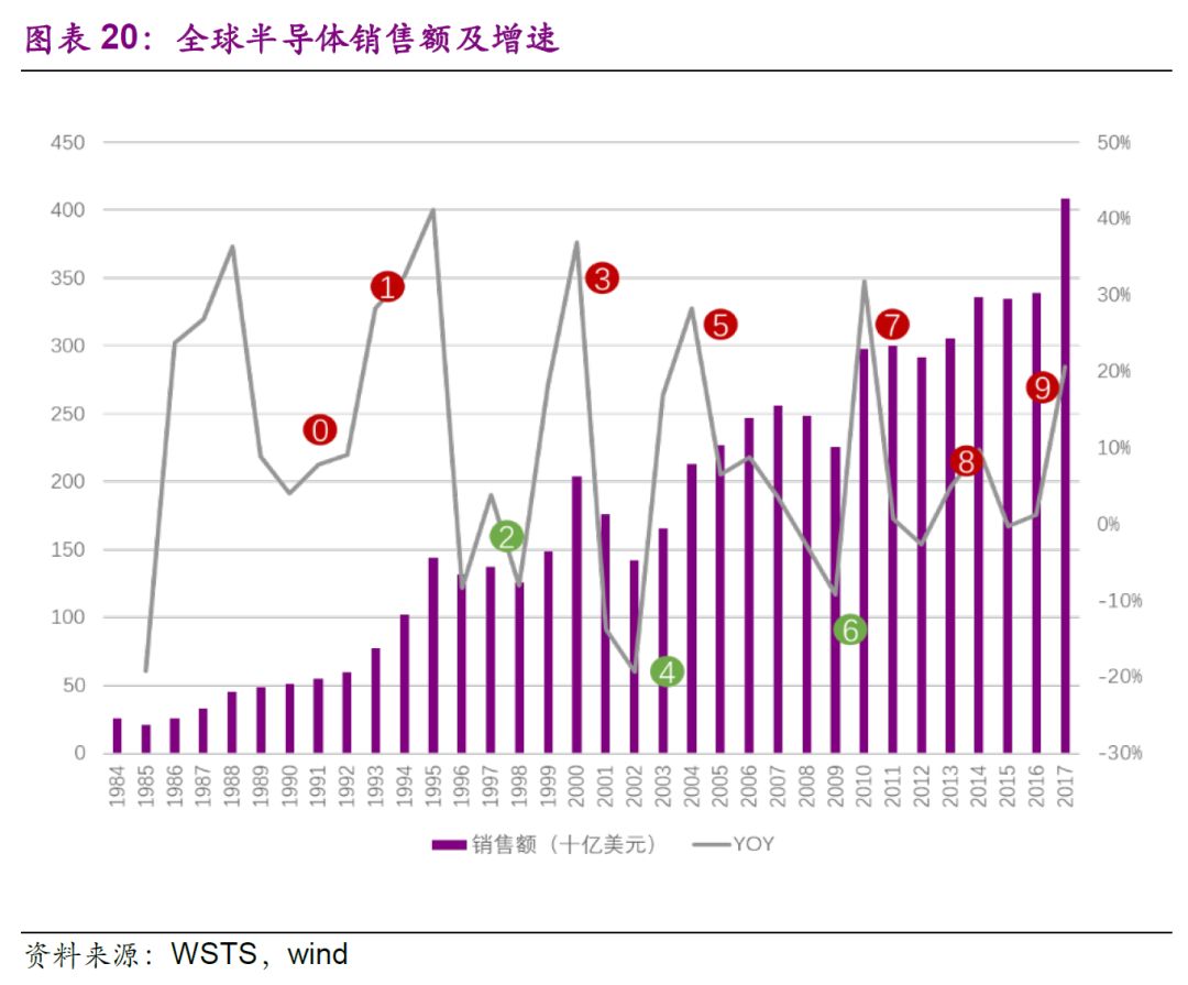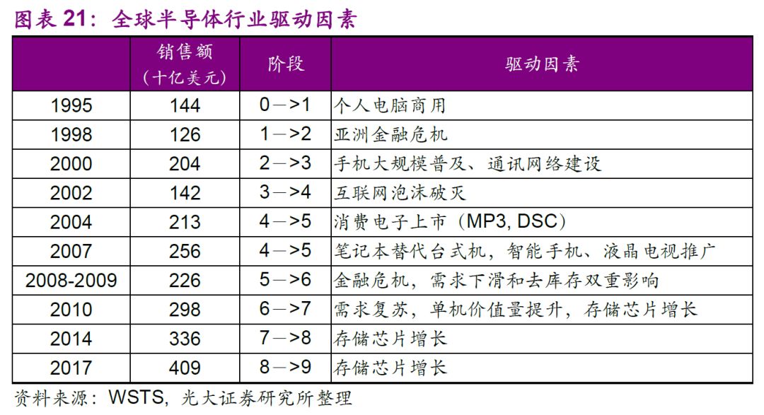 从全球半导体销售额同比增速上看,全球半导体行业大致以4-6年为一个周期,景气周期与宏观经济、下游应用需求以及自身产能库存等因素密切相关。