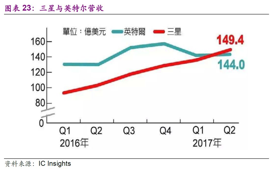 据ICInsights报道,DRAM2017年平均售价(ASP)同比上涨77%,销售总值达720亿美元,同比增长74%;NANDFlash2017年平均售价(ASP)同比上涨38%,销售总额达498亿美元,同比增长44%,NORFlash为43亿美元,导致全球存储器总体市场上扬增长58%。如若扣除存储器售价上扬的13%,则2017年全球半导体市场同比增长率仅为9%的水平。依靠DRAM和NAND闪存的出色表现,三星半导体在2017年第二季度超越英特尔,终结英特尔20多年雄踞半导体龙头位置的记录。