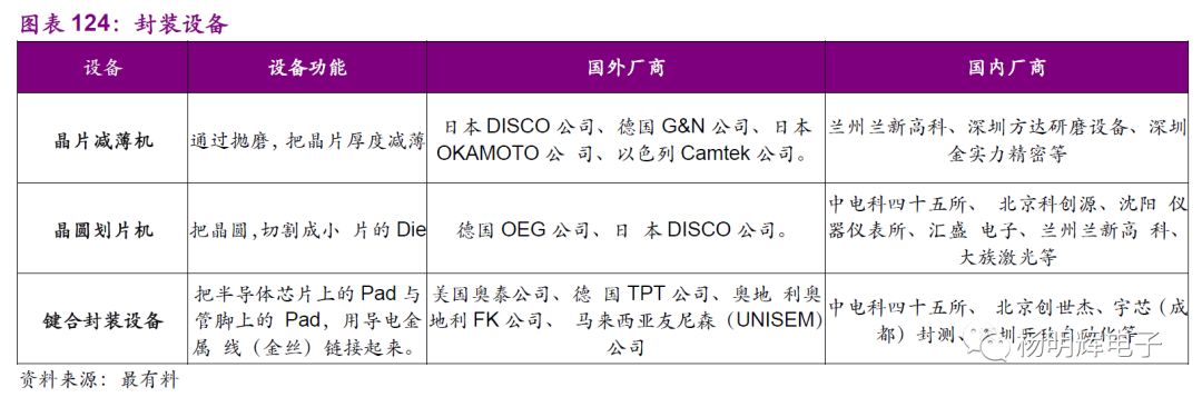 上海微电子:国内唯一的一家从事光刻机研发制造的公司。目前制造用光刻机只能做到90nm,与主流65nm以下还有较大差距。不过,封装使用的光刻机,达到1-2微米就可以使用,上海微电子研发制造的500系列步进投影光刻机,面向IC后道封装和MEMS/NEMS制造领域,国内市场占有率达80%以上。