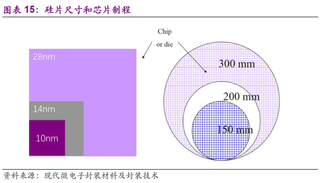 芯片的制程就是用来表征集成电路尺寸的大小的一个参数,随着摩尔定律发展,制程从0.5微米、0.35微米、0.25微米、0.18微米、0.15微米、0.13微米、90纳米、65纳米、45纳米、32纳米、28纳米、22纳米、14纳米,一直发展到现在的10纳米、7纳米、5纳米。目前,28nm是传统制程和先进制程的分界点。