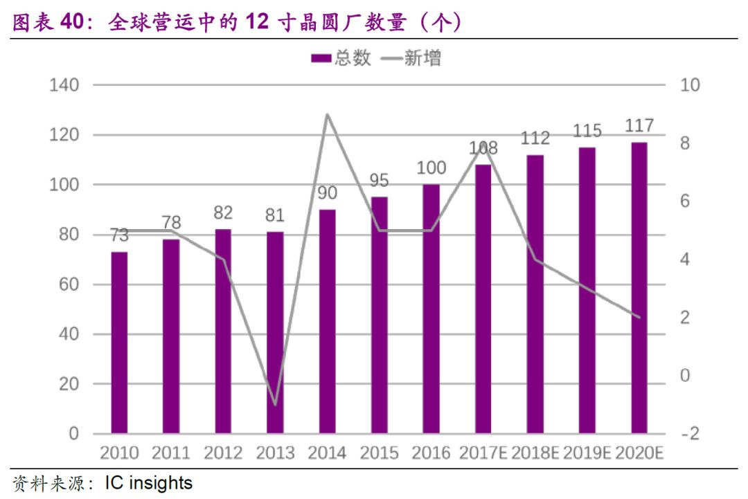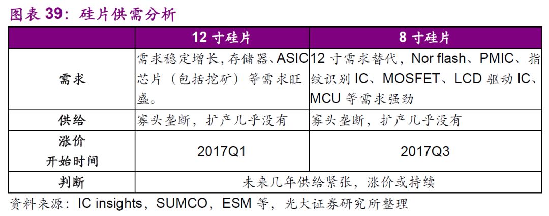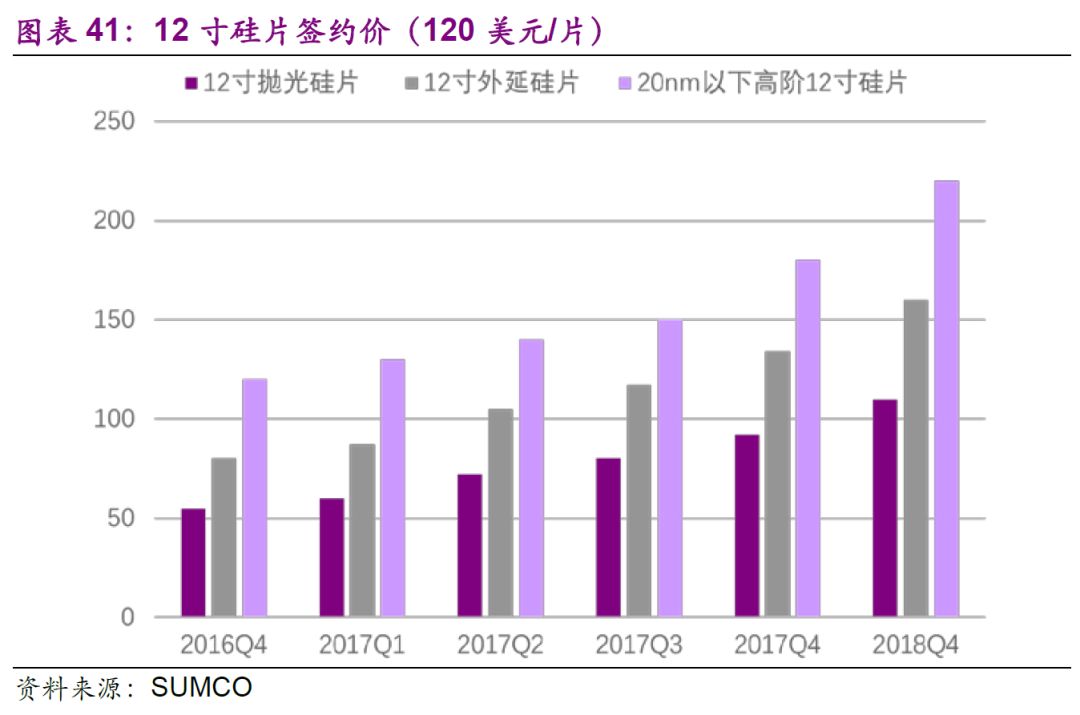 涨价:12寸硅片供不应求,缺货成常态,硅片价格逐步上升,下游晶圆厂开始去库存。信越半导体及SUMCO的12寸硅片签约价已从2017年的75美元/片上涨至120美元/片,涨幅高达60%。未来几年硅片供给仍然存在明显缺口,我们预计涨价趋势将持续,2018年12寸硅片将进一步涨价20%-30%左右。