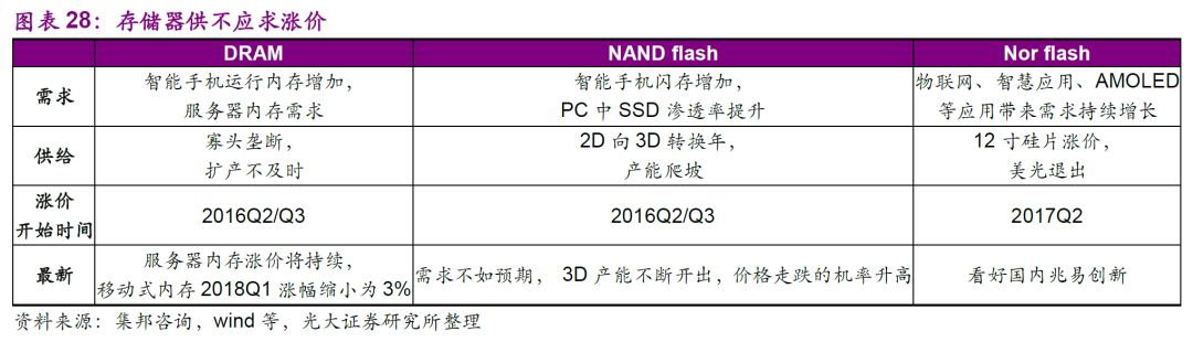 需求端:下游智能手机闪存存不断从16G到32G、64G、128G甚至256G升级导致嵌入式存储快速需求增长,同时随着SSD在PC中渗透率提升导致SSD需求快速增长。