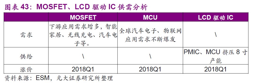 本轮涨价的根本原因为供需反转,并沿产业链传导,从存储器中DRAM和NAND供不应求涨价导致上游12寸硅片供不应求涨价,12寸晶圆代工厂涨价,NOR涨价,12寸硅片不足用8寸硅片代替,导致8寸硅片涨价,8寸晶圆代工厂涨价,传导下游电源管理IC、LCD/LED驱动IC、MCU、功率半导体MOSFET等涨价,涨价持续蔓延。此外,2017Q4加密币挖矿芯片半路杀出抢12寸晶圆先进制程产能。