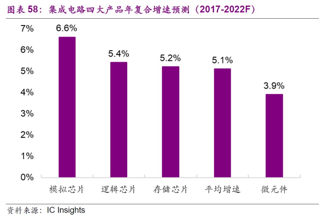 模拟芯片市场高速增长。根据ICInsights数据显示,2017-2022年整体集成电路市场年复合增长率为5.1%。在集成电路市场的四大产品类别:模拟、逻辑、存储和微元件中,模拟芯片市场增速最高达到6.6%。