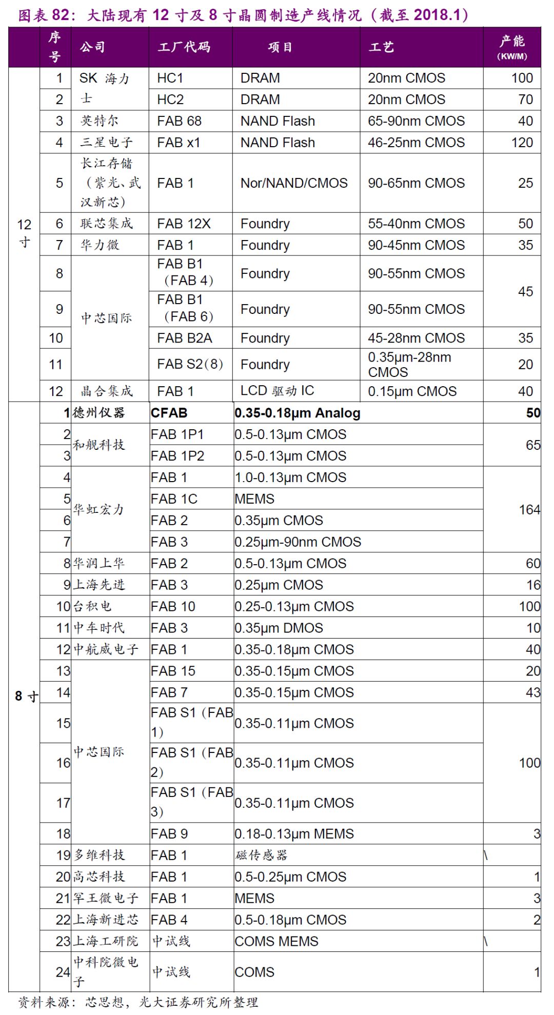 除了制程,建设晶圆制造产线还需要事先确定一个参数,即所需用的硅片尺寸。硅片根据其直径分为6寸(150mm)、8寸(200mm)、12寸(300mm)等类型,目前高端市场12寸为主流,中低端市场则一般采用8寸。晶圆制造产线的制程和硅片尺寸这两个参数一旦确定下来一般无法更改,因为如果要改建,则投资规模相当于新建一条产线。