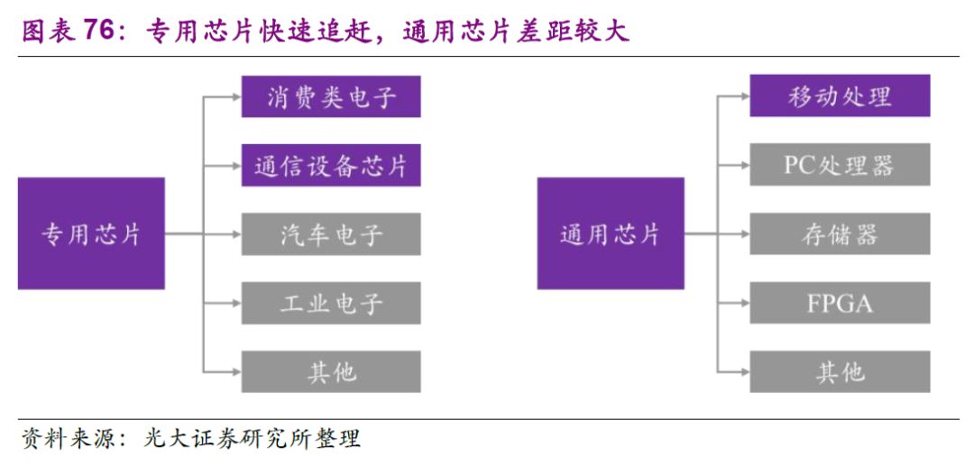 产品种类多。从技术复杂度和应用广度来看,集成电路主要可以分为高端通用和专用集成电路两大类。高端通用集成电路的技术复杂度高、标准统一、通用性强,具有量大面广的特征。它主要包括处理器、存储器,以及FPGA(现场可编程门阵列)、AD/DA(模数/数模转换)等。专用集成电路是针对特定系统需求设计的集成电路,通用性不强。每种专用集成电路都属于一类细分市场,例如,通信设备需要高频大容量数据交换芯片等专用芯片;汽车电子需要辅助驾驶系统芯片、视觉传感和图像处理芯片,以及未来的无人驾驶芯片等。