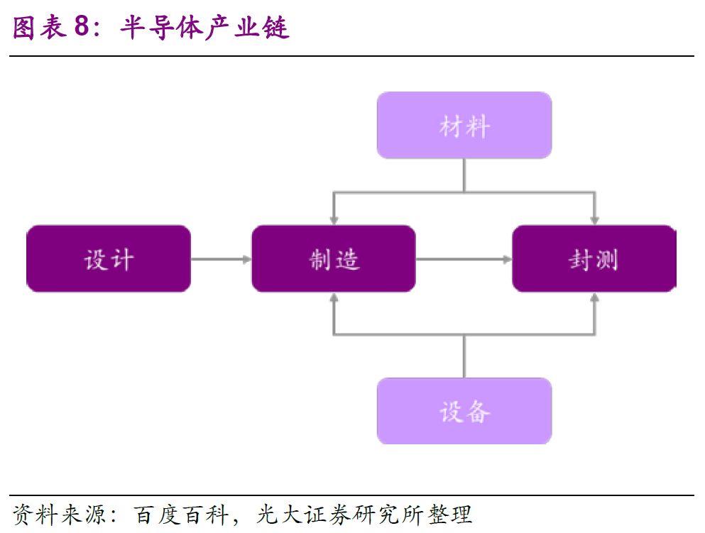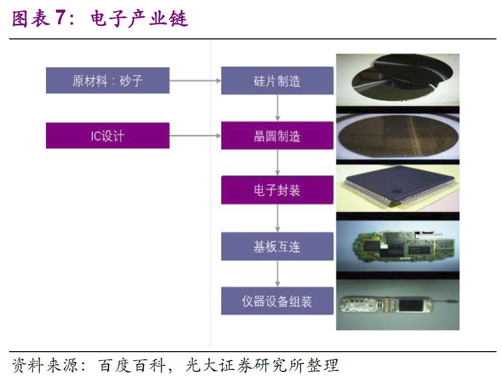 简单的讲,电子制造产业包括:原材料砂子-硅片制造-晶圆制造-封装测试-基板互联-仪器设备组装。集成电路产业链主要为设计、制造、封测以及上游的材料和设备。