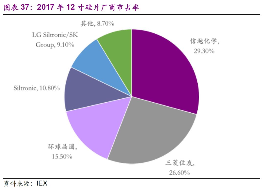 硅片供给属于寡头垄断市场,目前全球硅晶圆厂商以日本、台湾、德国等五大厂商为主,包括日本信越、日本三菱住友SUMCO、环球晶圆、德国Siltronic、韩国SKSiltronic,前五大供应商囊括约90%以上的市场份额。