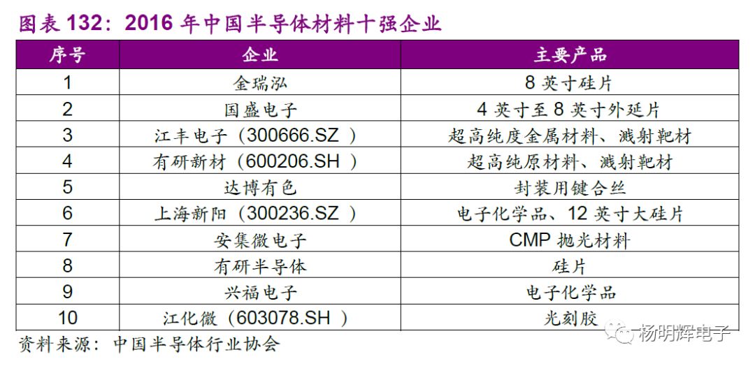 在2016年中国半导体材料十强企业中,江丰电子、有研新材、上海新阳和江化微四家为上市公司。