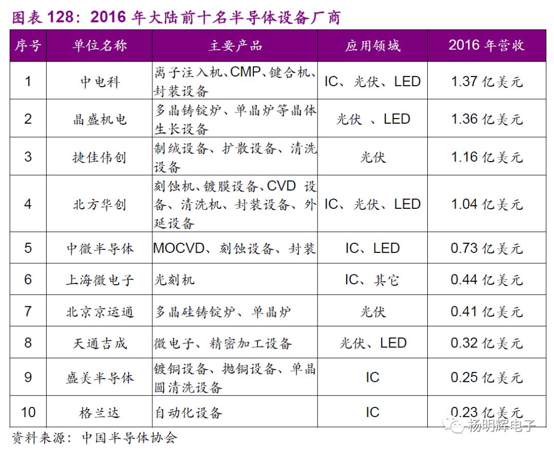 刻蚀机:2016年研发出了14nm工艺的硅刻蚀机,目前正在中芯国际研发的14nm工艺上验证使用。2017年11月,研发的中国首台适用于8英寸晶圆的金属刻蚀机成功搬入中芯国际的产线。薄膜沉积设备:28nm级别的PVD设备和单片退火设备领域实现了批量出货,14nm级别的ALD,ALPVD,LPCVD,HMPVD等多种生产设备正在产线验证中。清洗机:自研的12英寸单片清洗机产品主要应用于集成电路芯片制程,2017年8月成功收购Akrion公司后,公司的清洗机产品线将得以补充,形成涵盖应用于集成电路、先进封装、功率器件、微机电系统和半导体照明等半导体领域的8-12英寸批式和单片清洗机产品线。