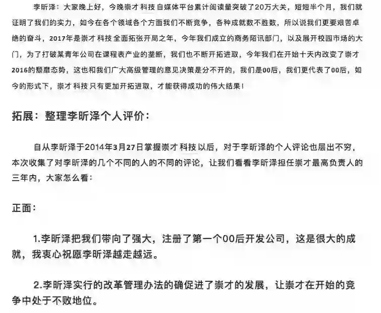 如果从产品、业务的角度来衡量崇才科技还不算一家成功的公司话,从品牌、公关的角度来看,李昕泽这么小的年纪,能做到如此境界,已经秒杀了不少公关公司。