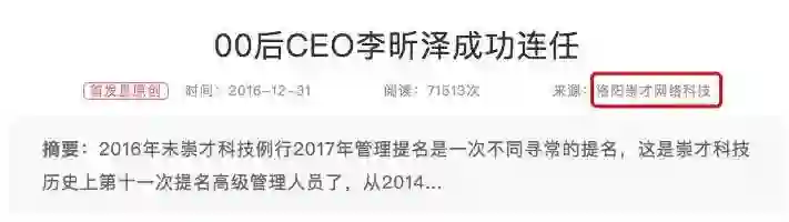 我叫李昕泽,今年17岁,是洛阳崇才网络科技有限责任公司CEO,这个也是中国00后第一个自主运营的公司,