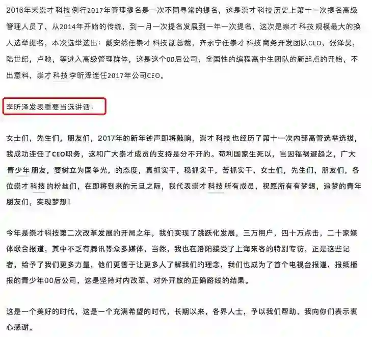 但李昕泽笃信自己的实力。“作为全球第一青少年开发公司,我们不畏艰险 一直拼搏 走到了今天这一步 我们不知道比其他小团队高到哪里去了”,他在微博上表示,“崇才科技 给自己打100分。”