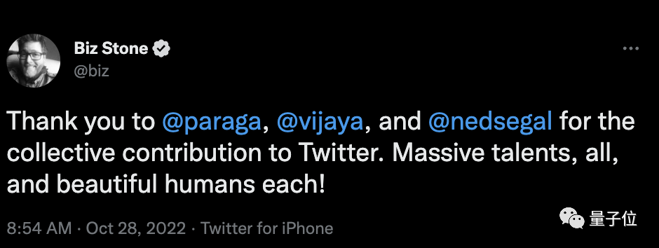 之后,推特的联合创始人Biz Stone发布推文感谢他们对公司的“集体贡献”。