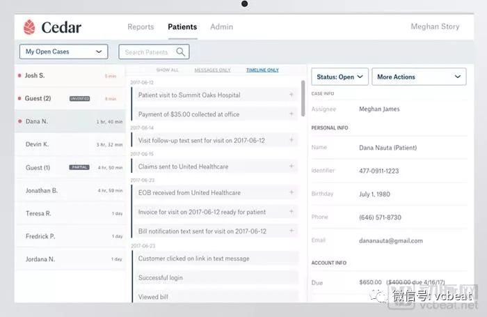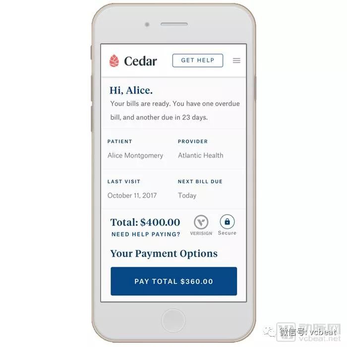 Cedar推出的金融管理平台,通过与医疗机构合作,帮助他们整理患者未支付的账单。当患者支付医疗费用时,可以选择同意从Cedar收到通知,Cedar就代表医疗服务提供商,向患者发送账单。