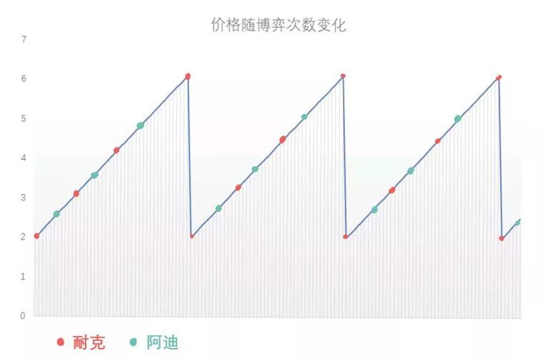 这时候只剩耐克了,耐克也不傻,既然没人和我竞争,那么我为啥要出6块呢,于是赶紧调到2块,这时候阿迪又会进场,周而复始的循环开始了。