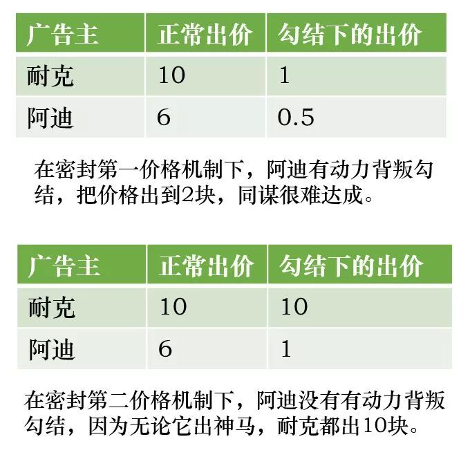 依然拿耐克阿迪来打比喻,耐克的心理出价是10块,阿迪是6块,这时候他们勾结,阿迪出1块,耐克出10块,最终耐克只需要花1块钱就能买走这个广告位,受伤的是广告平台。聪明的人立马会说——难道“第一密封价格”不会出现这种情况吗?比如耐克和阿迪商量好,耐克出1块,阿迪出0.5元,还是耐克以1块钱的价格买走这个广告位啊!