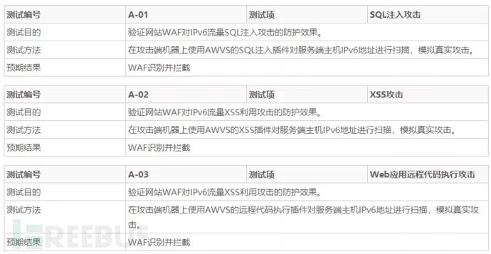 主要评估客户网站安全设备对基于IPv6流量的传统网络及应用攻击的防护效果,验证选取一些典型攻击方式,如SQL注入、XSS、远程溢出等进行测试。