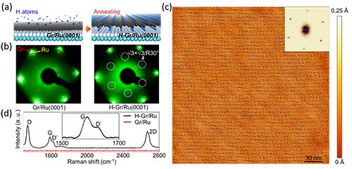 最近, 中国科学院物理研究所/北京凝聚态物理国家研究中心高鸿钧院士研究团队的陈辉、包德亮(共同第一作者)和杜世萱研究员(共同通讯作者)等通过实验与DFT理论计算发现,在Ru(0001)上石墨烯摩尔超晶格模板可以制备晶态三分之一氢化石墨烯,且尺寸很大质量很高。相对于氢化前的石墨烯样品,在石墨烯对应的低能电子衍射(LEED)点阵的√3 × √3/R30°位置出现了新的一套格点(图1)。氢化后石墨烯的拉曼(Raman)光谱中石墨烯晶格的G和2D特征峰恢复,预示着Ru基底与石墨烯之间的界面有氢原子存在并有效地减弱了石墨烯与金属基底的强相互作用(图1)。