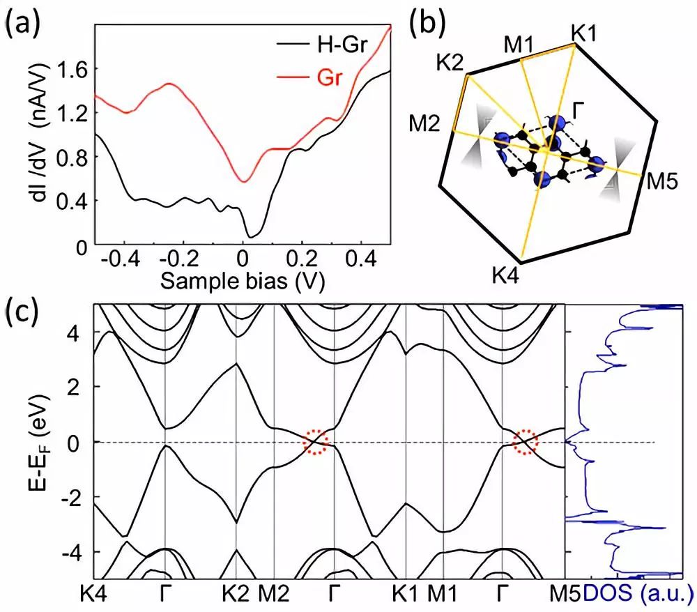 图3. 晶态三分之一氢化石墨烯dI/dV谱及DFT计算的能带结构与态密度图。
