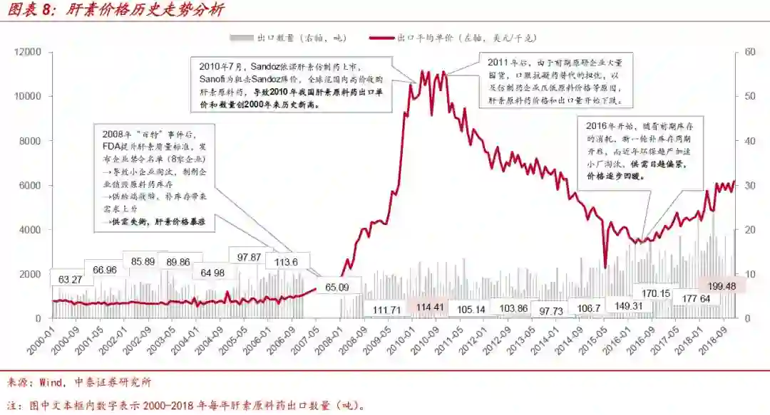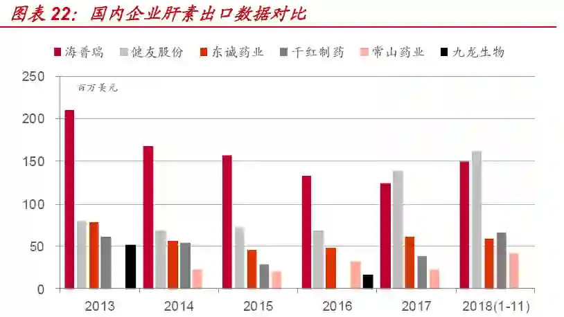 海普瑞抓住“百特”事件机遇,跃升为国内肝素龙头企业,健友股份在新一轮肝素周期中后来居上,2017、2018年出口量持续超越海普瑞。