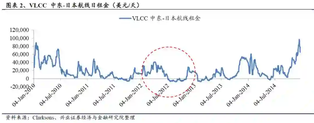2012年初欧美开始对伊朗石油进行禁运制裁,从结果来看,2012及2013年VLCC日租金的年均值并未产生较大变化,但短期运价有快速攀升。