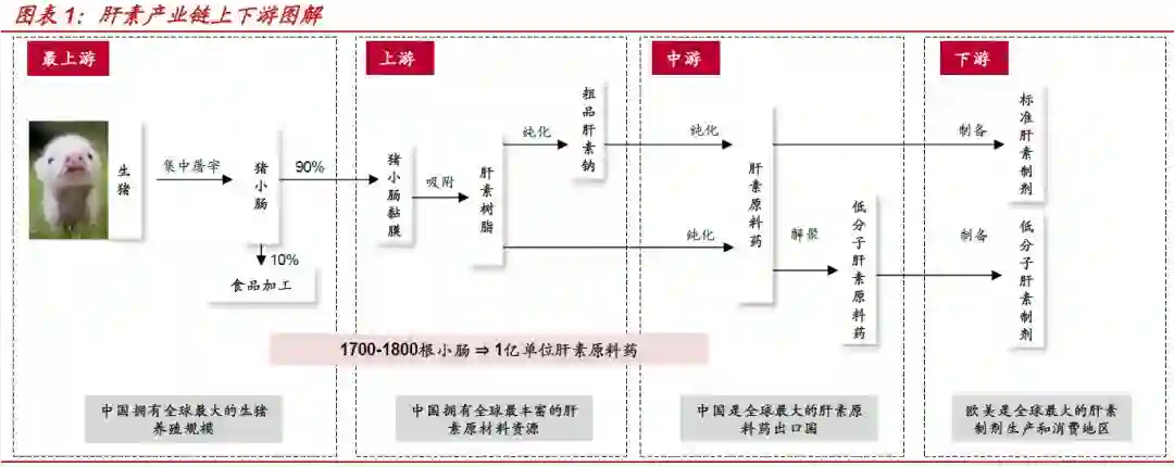 由于结构复杂,肝素无法通过化学合成,只能由猪小肠中获取,产业链最上游为生猪:猪小肠→肝素粗品→肝素原料药→肝素制剂。