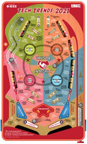 过去5年多来,国际科技和医学出版协会就影响科技出版业的未来趋势在业界主持了一系列智库形式的研讨。研讨的推动者,Eefke Smit女士对学术交流领域的主要趋势以及成果转化有着深刻的见解,其最新成果是“科技出版的技术趋势·展望2021”图表。
