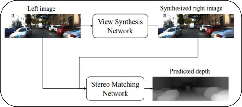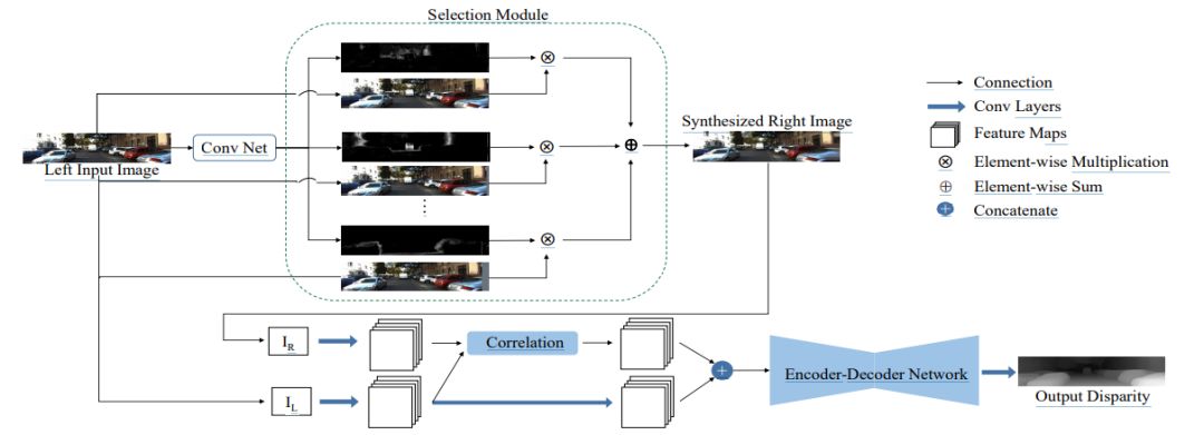 基于上述分析,本文方法提出了一种新颖的面向单目深度估计的算法框架,把单目深度估计分解为两个过程,即视图合成过程和双目匹配过程。模型的主要设计思路在于: