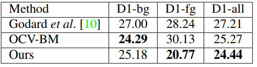 为了进一步确认目前性能最优异的单目深度估计方法和双目深度估计方法的差距,本文在KITTI 2015双目匹配测试集上对比了SVS模型与现有最优性能的单目深度估计方法以及双目匹配Block-Matching方法 (OCV-BM),相关结果总结在表2中,本文的SVS模型首次超越了双目匹配Block-Matching算法。