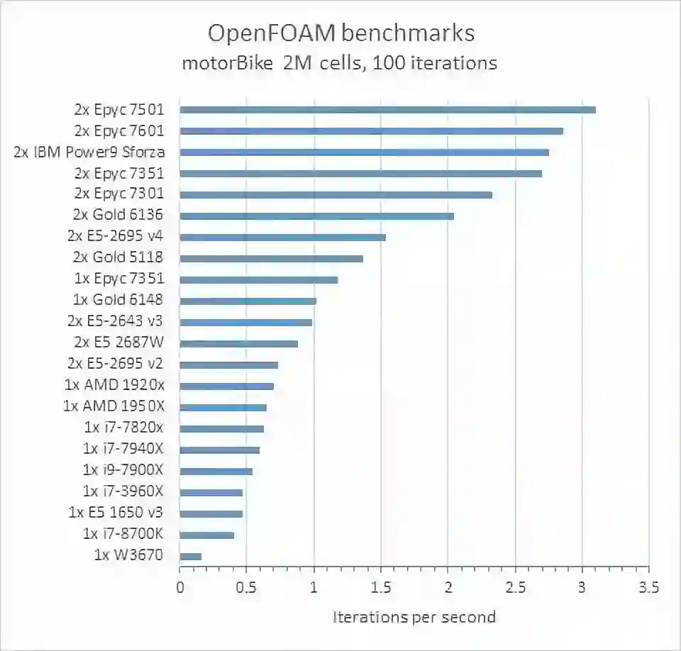根据第三方组织OpenFOAM的基准案例测试,下图显示了每个硬件配置的每秒最高迭代次数,可以看到Power9的性能处于领先位置。