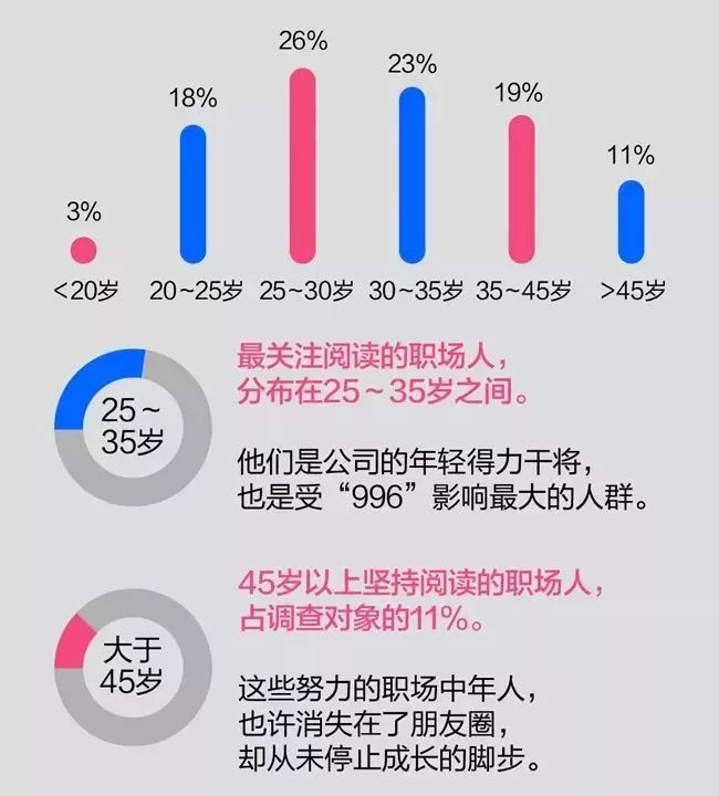 就拿常被舆论提及的职场中年来说,在这次调查中,45岁以上坚持阅读的职场人就占了调查对象的12%。这些努力的职场中年人,也许消失在了朋友圈,却从未停止成长的脚步。