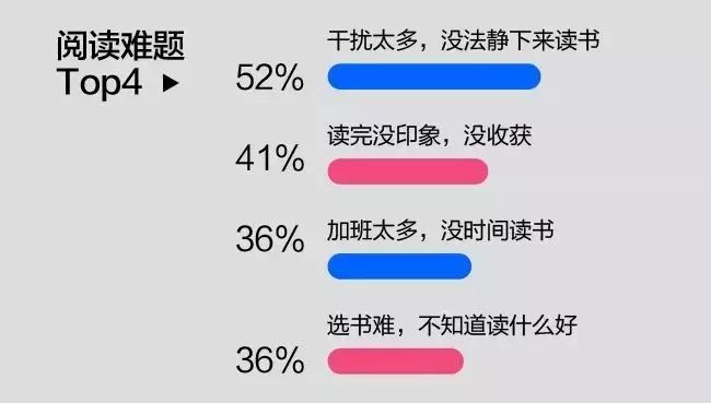 在我们的惯常认知中,职场人事务繁多,没时间读书肯定是最大难题,在众多职场人票选过后,我们发现反而52%的人的阅读难题是“干扰太多,没法静下来读书”,只有36%的人,选择了“加班太多,没时间读书”。