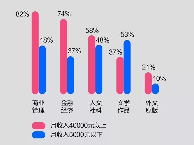 在月收入5000元以下的人群中,有48%的人选择商业管理,而月收入超过40000元的人群中,有超过83%的人选择了商业管理。