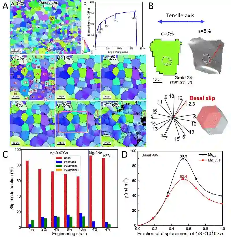 近日,上海交大轻合金精密成型国家工程研究中心材料智能设计与加工研究室在镁合金变形领域取得重要研究进展。该论文采用原位EBSD方法分析Mg-0.47wt.%Ca合金在拉伸过程中的变形行为。对不同应变量下的滑移系进行统计,发现Mg-Ca合金中产生了大量的非基面位错,而这在纯镁中是较难产生的。